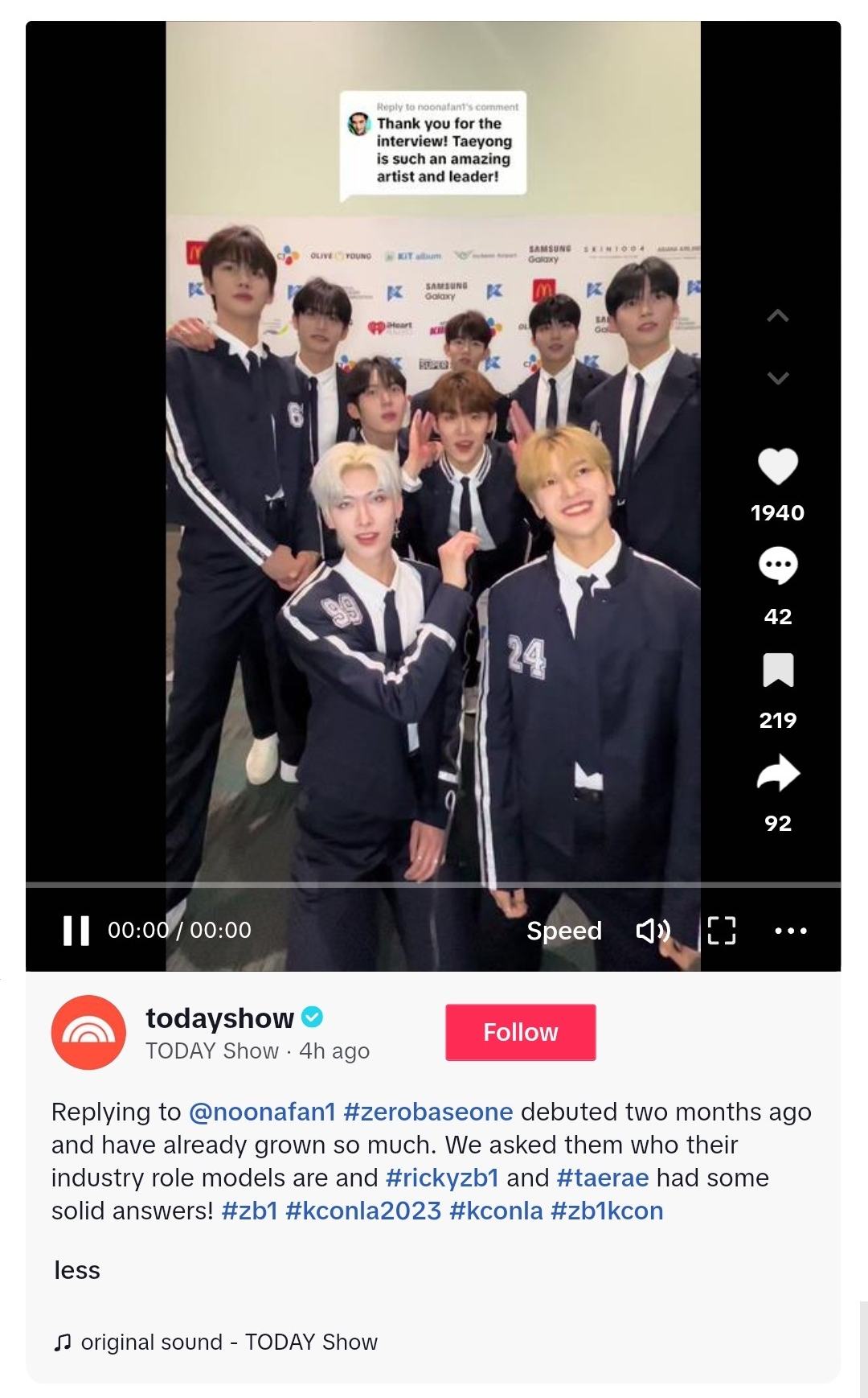 Replying to @noonafan1 #zerobaseone debuted two months ago and have already grown so much. We asked them who their industry role models are and #rickyzb1 and #taerae had some solid answers! #zb1 #kconla2023 #kconla #zb1kcon