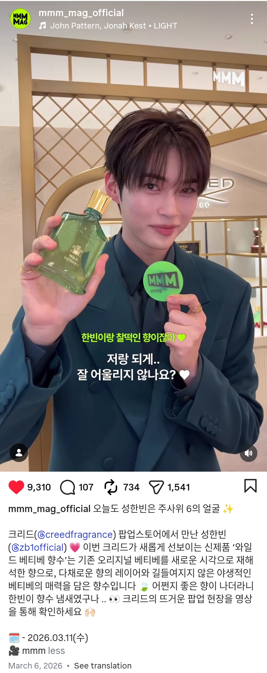 크리드(@creedfragrance) 팝업스토어에서 만난 성한빈(@zb1official) 💗 이번 크리드가 새롭게 선보이는 신제품 ‘와일드 베티베 향수’는 기존 오리지널 베티베를 새로운 시각으로 재해석한 향으로, 다채로운 향의 레이어와 길들여지지 않은 야생적인 베티베의 매력을 담은 향수입니다 🍃 어쩐지 좋은 향이 나더라니 한빈이 향수 냄새였구나 .. 👀 크리드의 뜨거운 팝업 현장을 영상을 통해 확인하세요 🙌🏻
