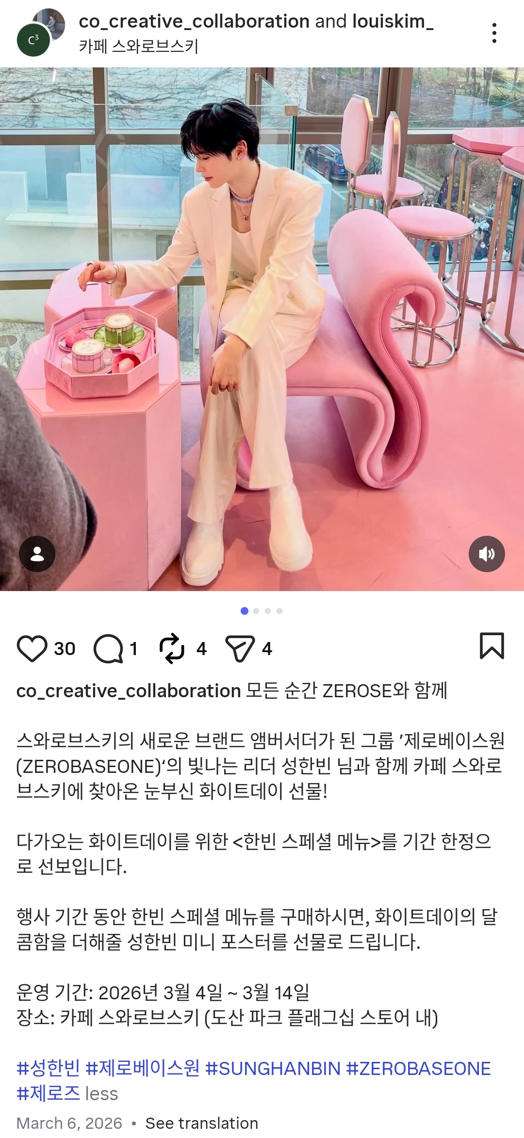 스와로브스키의 새로운 브랜드 앰버서더가 된 그룹 ’제로베이스원(ZEROBASEONE)‘의 빛나는 리더 성한빈 님과 함께 카페 스와로브스키에 찾아온 눈부신 화이트데이 선물!
