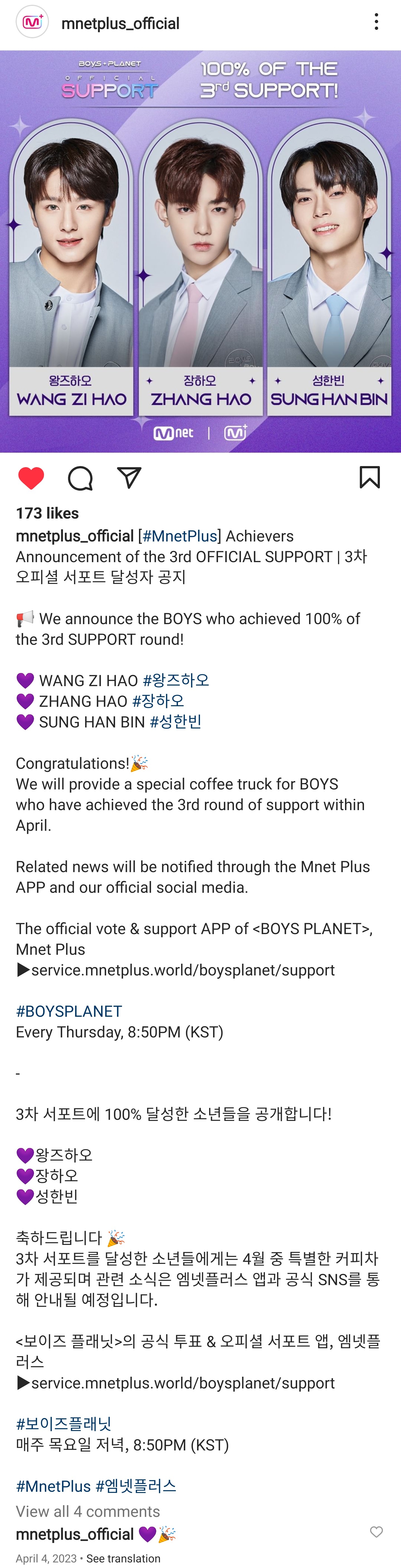 3차 서포트를 달성한 소년들에게는 4월 중 특별한 커피차가 제공되며 관련 소식은 엠넷플러스 앱과 공식 SNS를 통해 안내될 예정입니다.