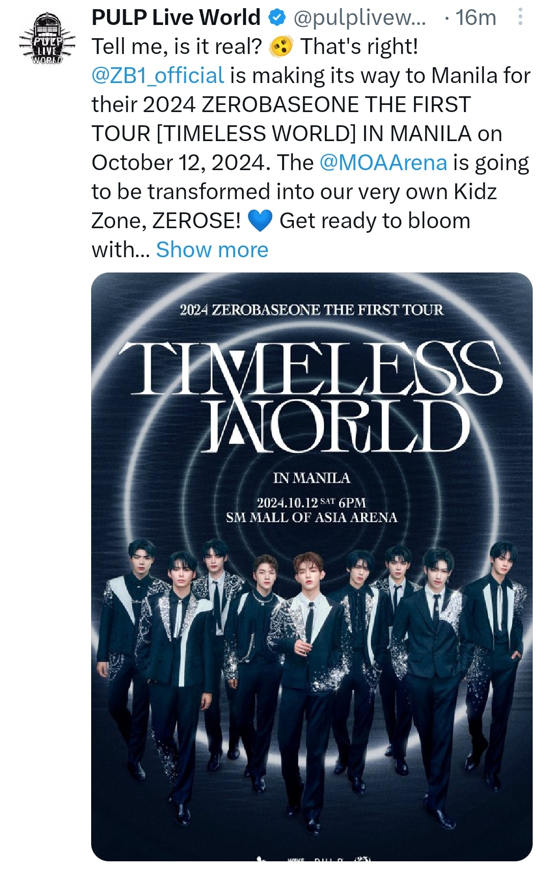 Tell me, is it real? 🫨 That's right! @ZB1_official is making its way to Manila for their 2024 ZEROBASEONE THE FIRST TOUR [TIMELESS WORLD] IN MANILA on October 12, 2024. The @MOAArena is going to be transformed into our very own Kidz Zone, ZEROSE! 💙 Get ready to bloom with excitement! 🌹