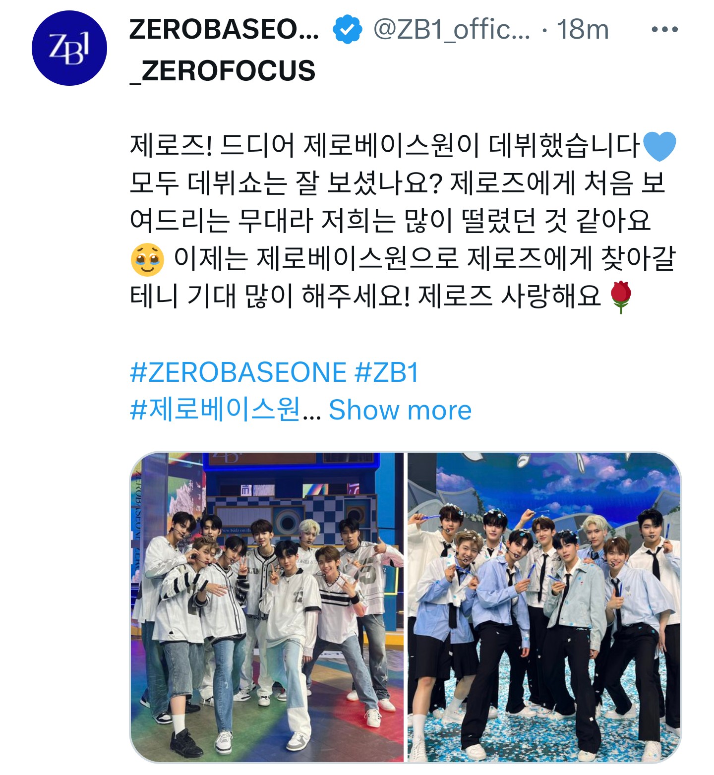 제로즈! 드디어 제로베이스원이 데뷔했습니다💙 모두 데뷔쇼는 잘 보셨나요? 제로즈에게 처음 보여드리는 무대라 저희는 많이 떨렸던 것 같아요🥹 이제는 제로베이스원으로 제로즈에게 찾아갈 테니 기대 많이 해주세요! 제로즈 사랑해요🌹
