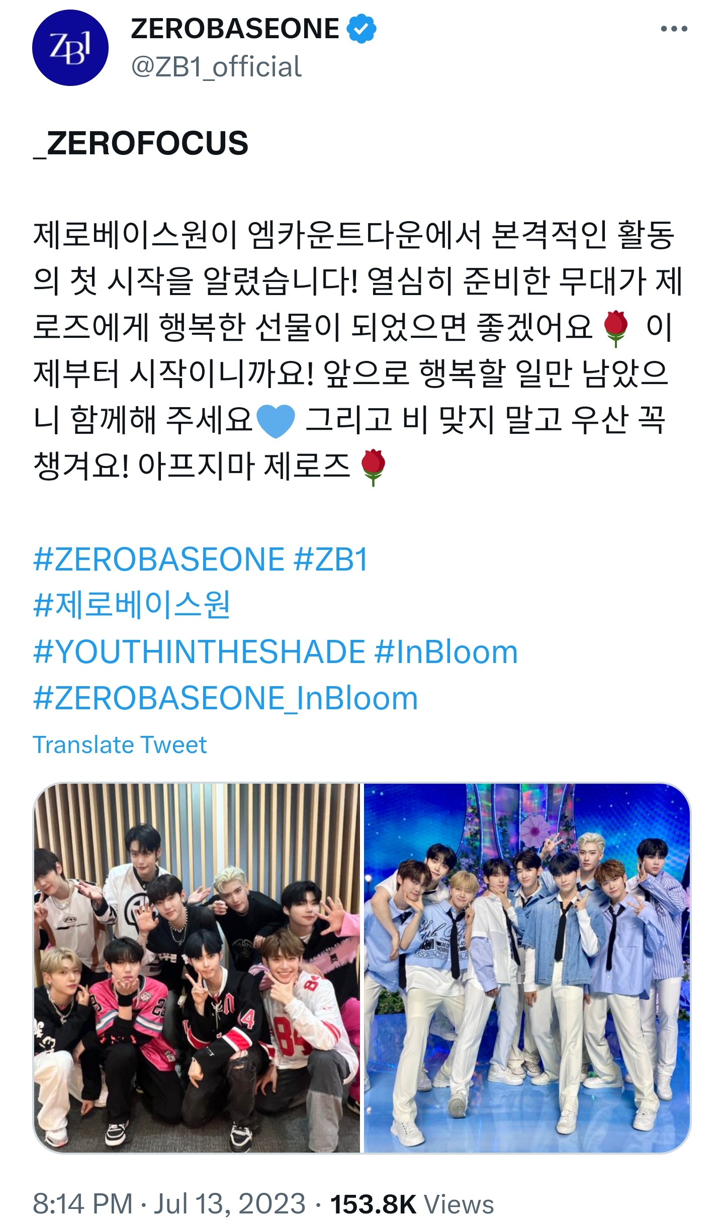 제로베이스원이 엠카운트다운에서 본격적인 활동의 첫 시작을 알렸습니다! 열심히 준비한 무대가 제로즈에게 행복한 선물이 되었으면 좋겠어요🌹 이제부터 시작이니까요! 앞으로 행복할 일만 남았으니 함께해 주세요💙 그리고 비 맞지 말고 우산 꼭 챙겨요! 아프지마 제로즈🌹