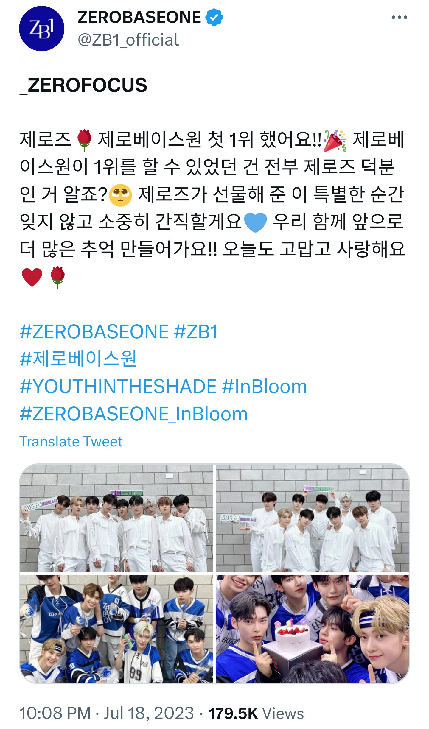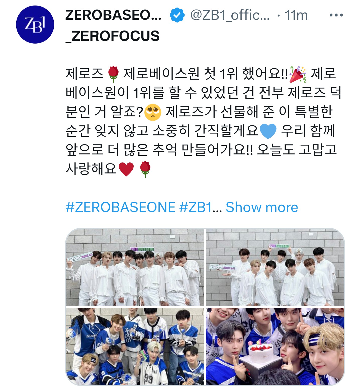 제로즈🌹제로베이스원 첫 1위 했어요!!🎉 제로베이스원이 1위를 할 수 있었던 건 전부 제로즈 덕분인 거 알죠?🥺 제로즈가 선물해 준 이 특별한 순간 잊지 않고 소중히 간직할게요💙 우리 함께 앞으로 더 많은 추억 만들어가요!! 오늘도 고맙고 사랑해요♥️🌹