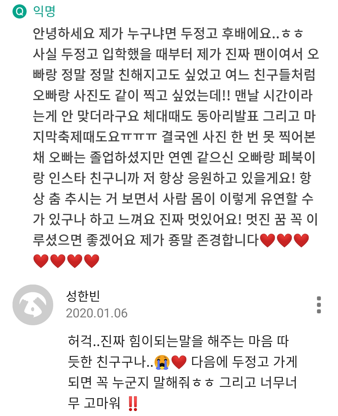 안녕하세요 제가 누구냐면 두정고 후배에요..ㅎㅎ 사실 두정고 입학했을 때부터 제가 진짜 팬이여서 오빠랑 정말 정말 친해지고도 싶었고 여느 친구들처럼 오빠랑 사진도 같이 찍고 싶었는데!! 맨날 시간이라는게 안 맞더라구요 체대때도 동아리발표 그리고 마지막축제때도요ㅠㅠㅠ 결국엔 사진 한 번 못 찍어본 채 오빠는 졸업하셨지만 연옌 같으신 오빠랑 페북이랑 인스타 친구니까 저 항상 응원하고 있을게요! 항상 춤 추시는 거 보면서 사람 몸이 이렇게 유연할 수가 있구나 하고 느껴요 진짜 멋있어요! 멋진 꿈 꼭 이루셨으면 좋겠어요 제가 죵말 존경합니다❤️❤️❤️❤️❤️❤️❤️