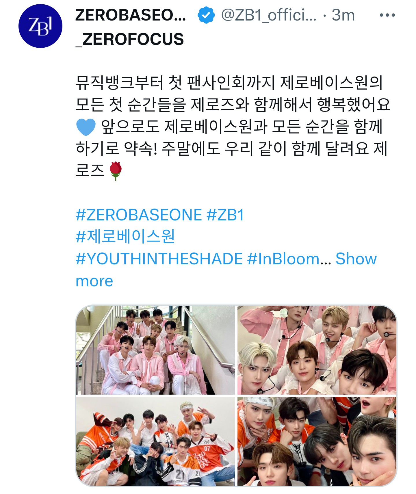 뮤직뱅크부터 첫 팬사인회까지 제로베이스원의 모든 첫 순간들을 제로즈와 함께해서 행복했어요💙 앞으로도 제로베이스원과 모든 순간을 함께하기로 약속! 주말에도 우리 같이 함께 달려요 제로즈🌹