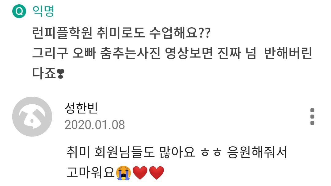 런피플학원 취미로도 수업해요?? 그리구 오빠 춤추는사진 영상보면 진짜 넘 반해버린다죠❣