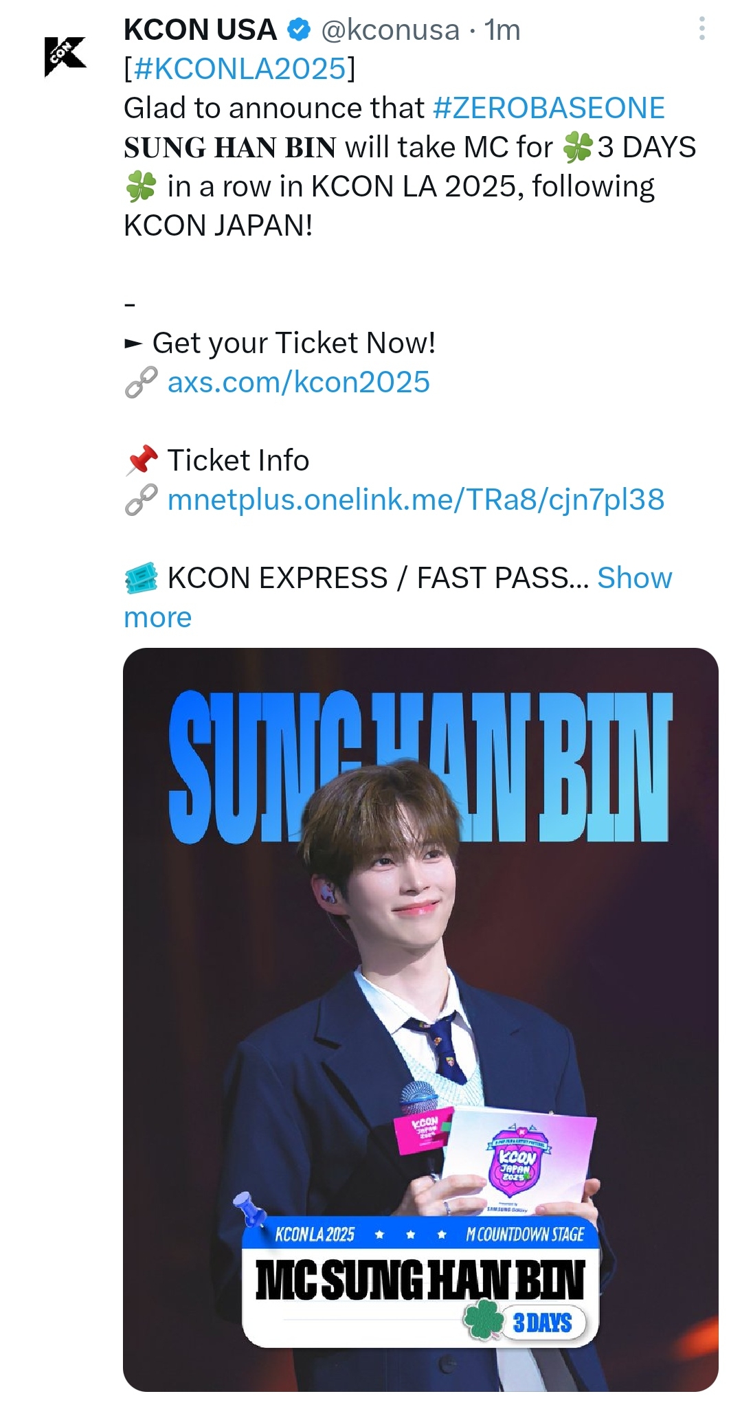 Glad to announce that #ZEROBASEONE 𝐒𝐔𝐍𝐆 𝐇𝐀𝐍 𝐁𝐈𝐍 will take MC for 🍀3 DAYS🍀 in a row in KCON LA 2025, following KCON JAPAN!