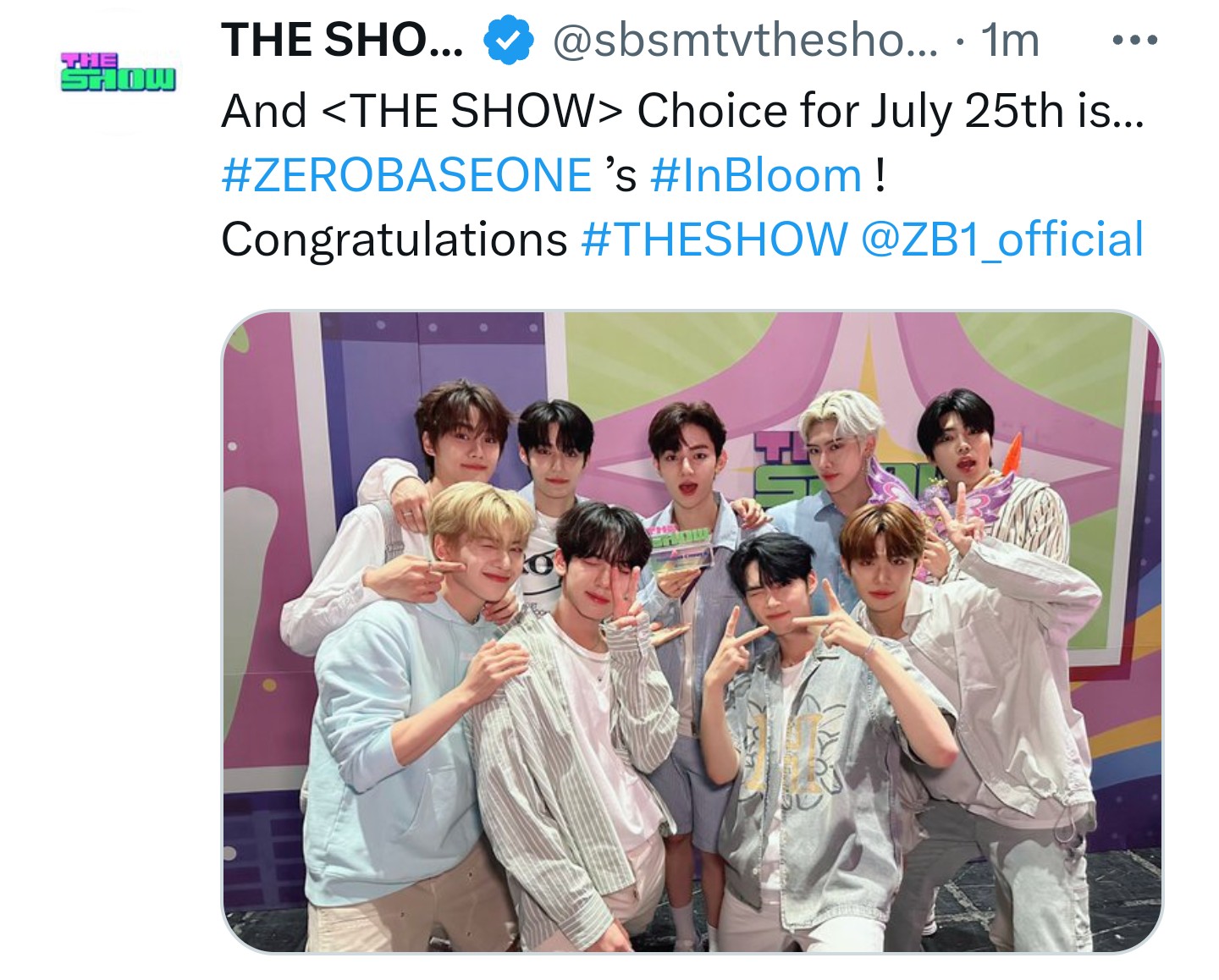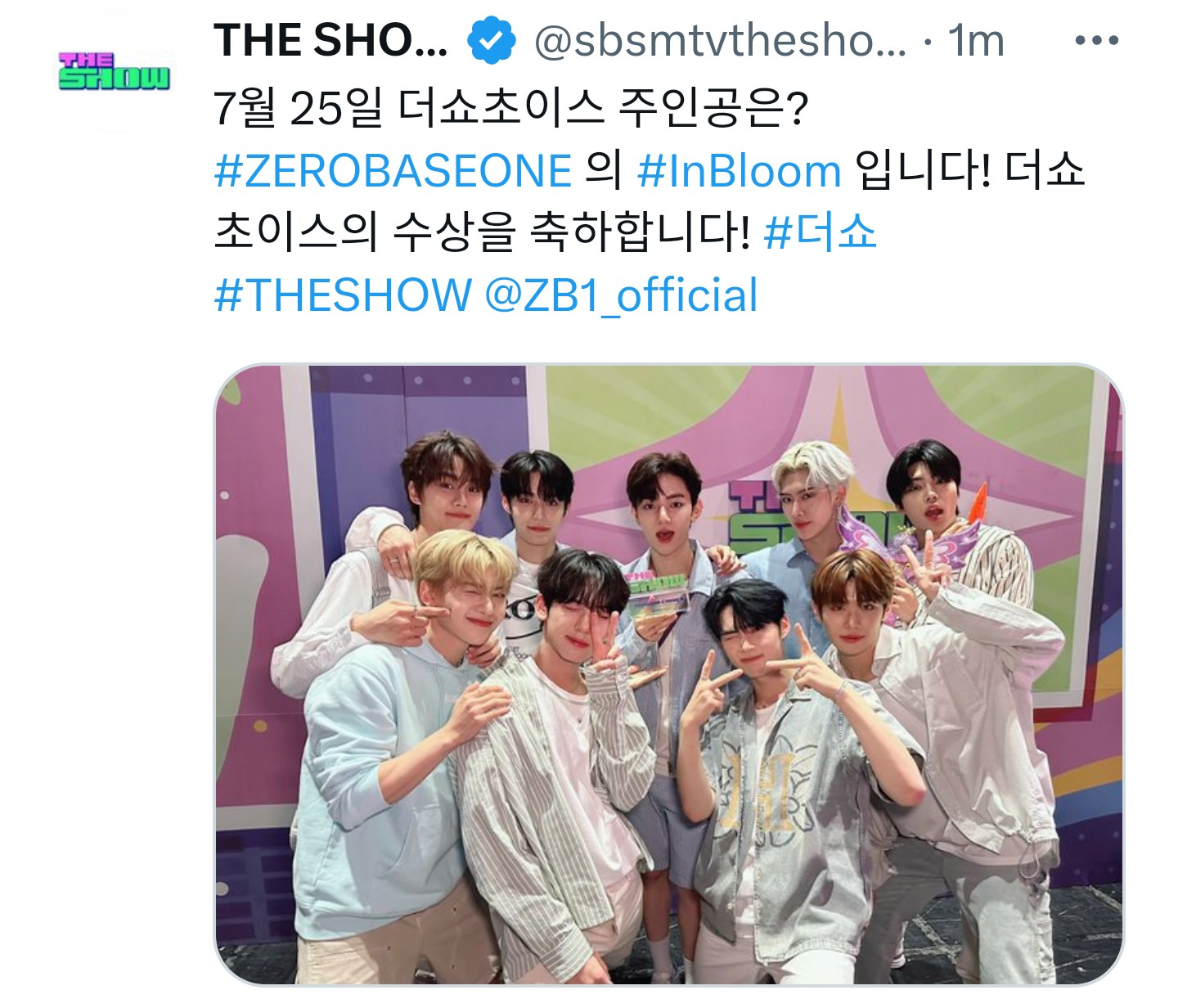 7월 25일 더쇼초이스 주인공은? #ZEROBASEONE 의 #InBloom 입니다! 더쇼초이스의 수상을 축하합니다! #더쇼 #THESHOW @ZB1_official