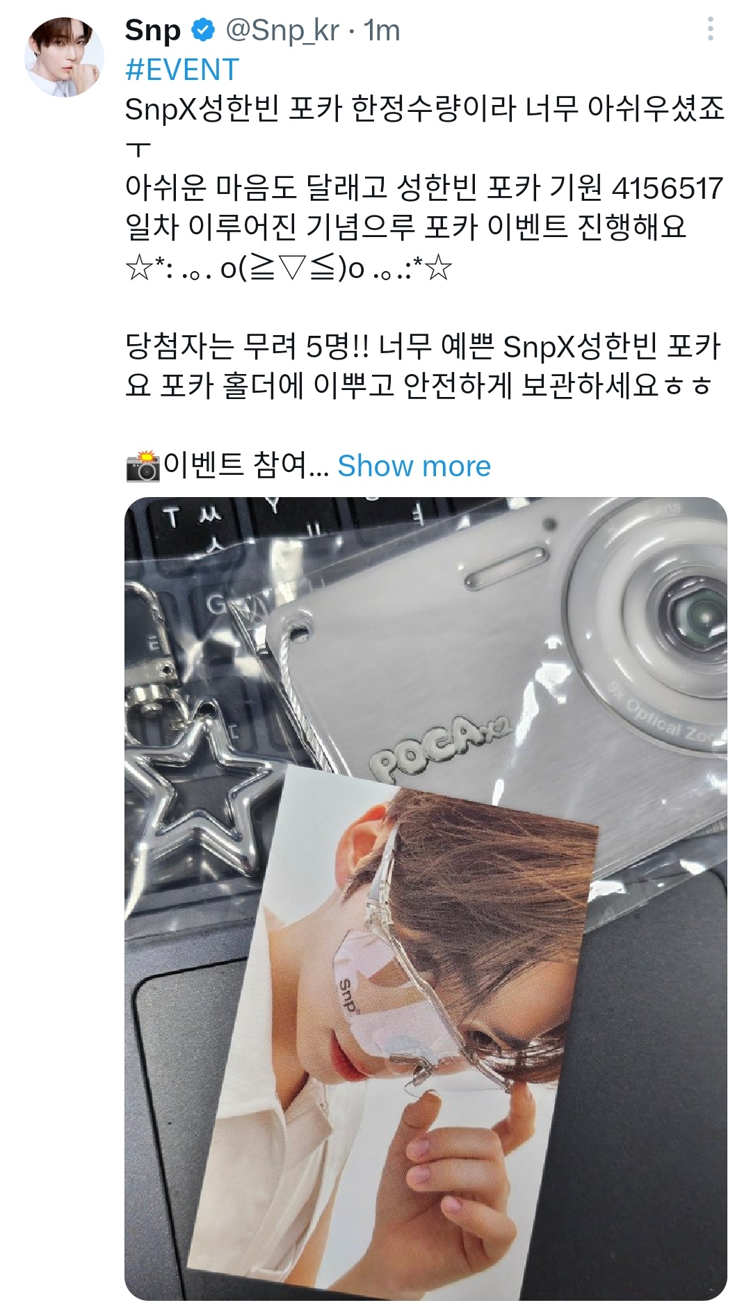 당첨자는 무려 5명!! 너무 예쁜 SnpX성한빈 포카 요 포카 홀더에 이뿌고 안전하게 보관하세요ㅎㅎ