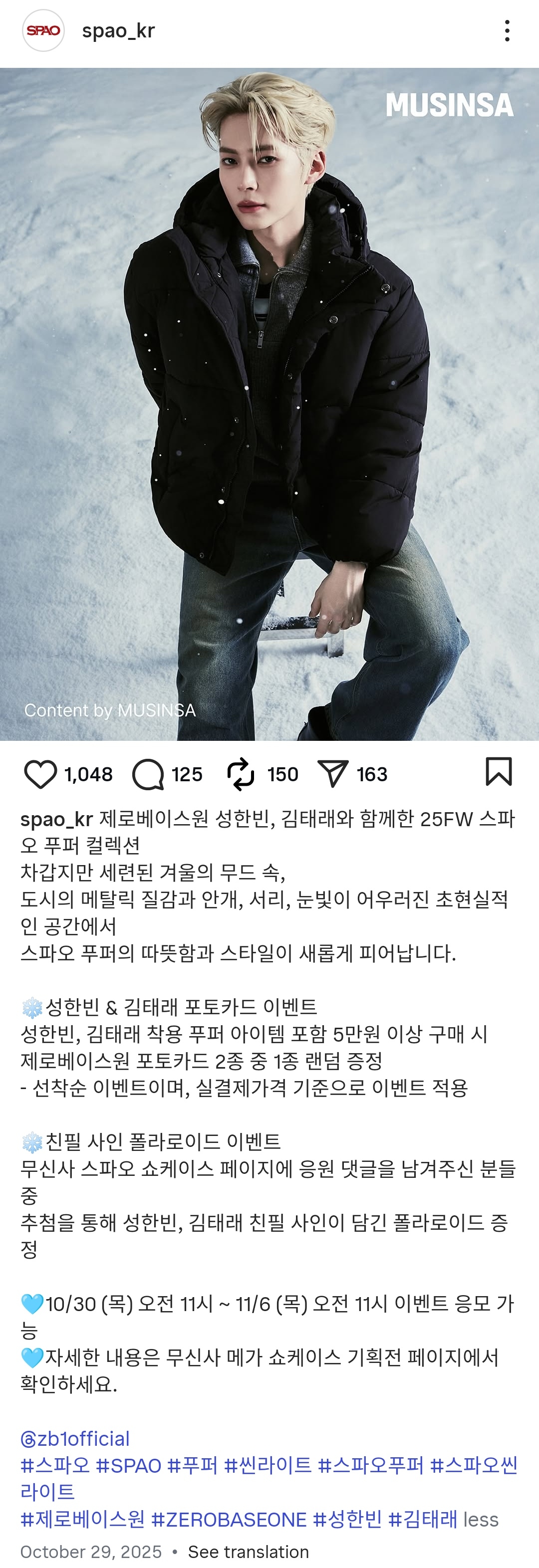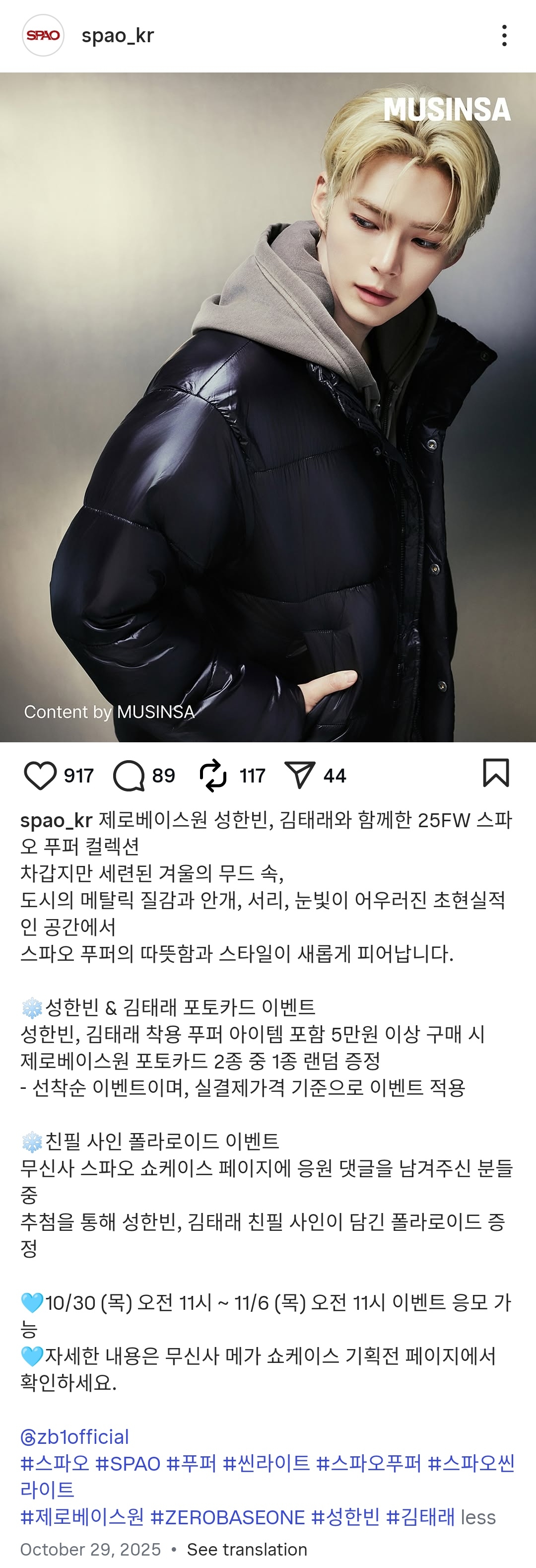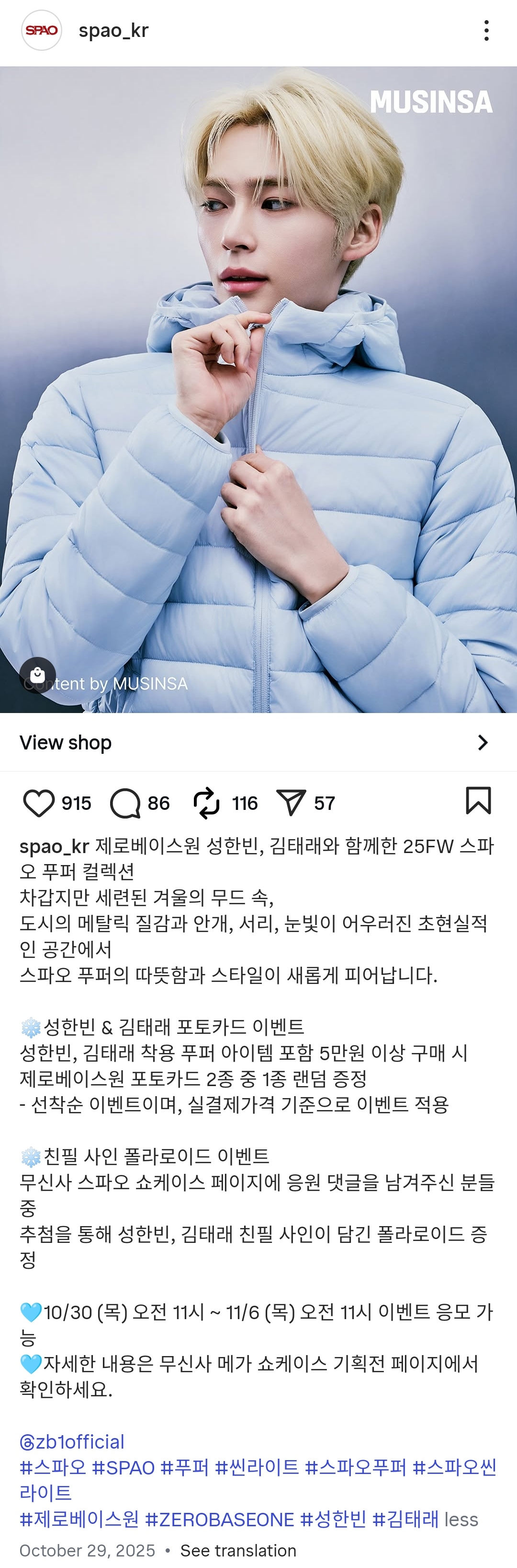 제로베이스원 성한빈, 김태래와 함께한 25FW 스파오 푸퍼 컬렉션