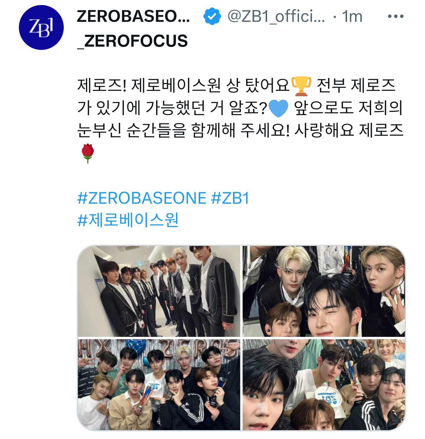 제로즈! 제로베이스원 상 탔어요🏆 전부 제로즈가 있기에 가능했던 거 알죠?💙 앞으로도 저희의 눈부신 순간들을 함께해 주세요! 사랑해요 제로즈🌹