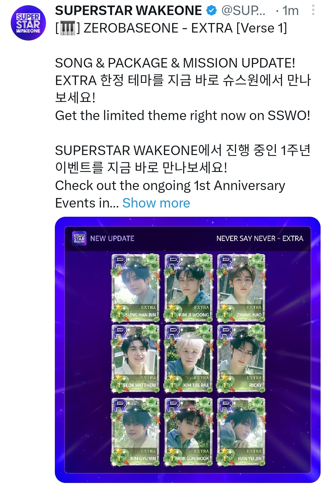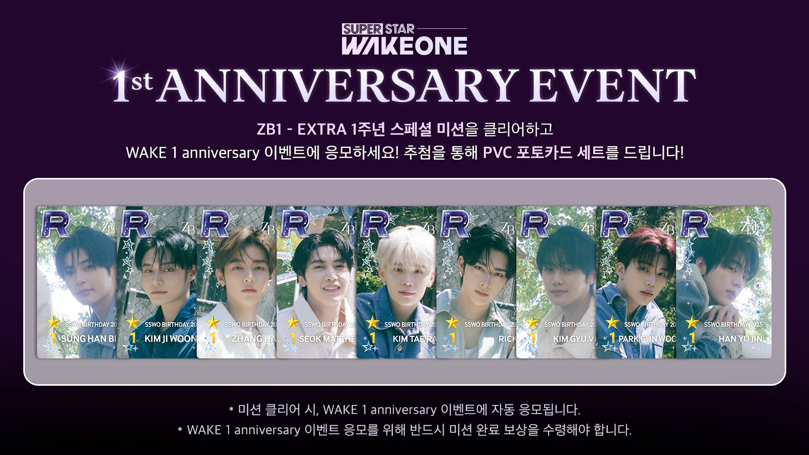 Complete the ZB1 - EXTRA 1st Anniversary Special Mission in SUPERSTAR WAKEONE now and enter the WAKE 1 anniversary event! 🎁