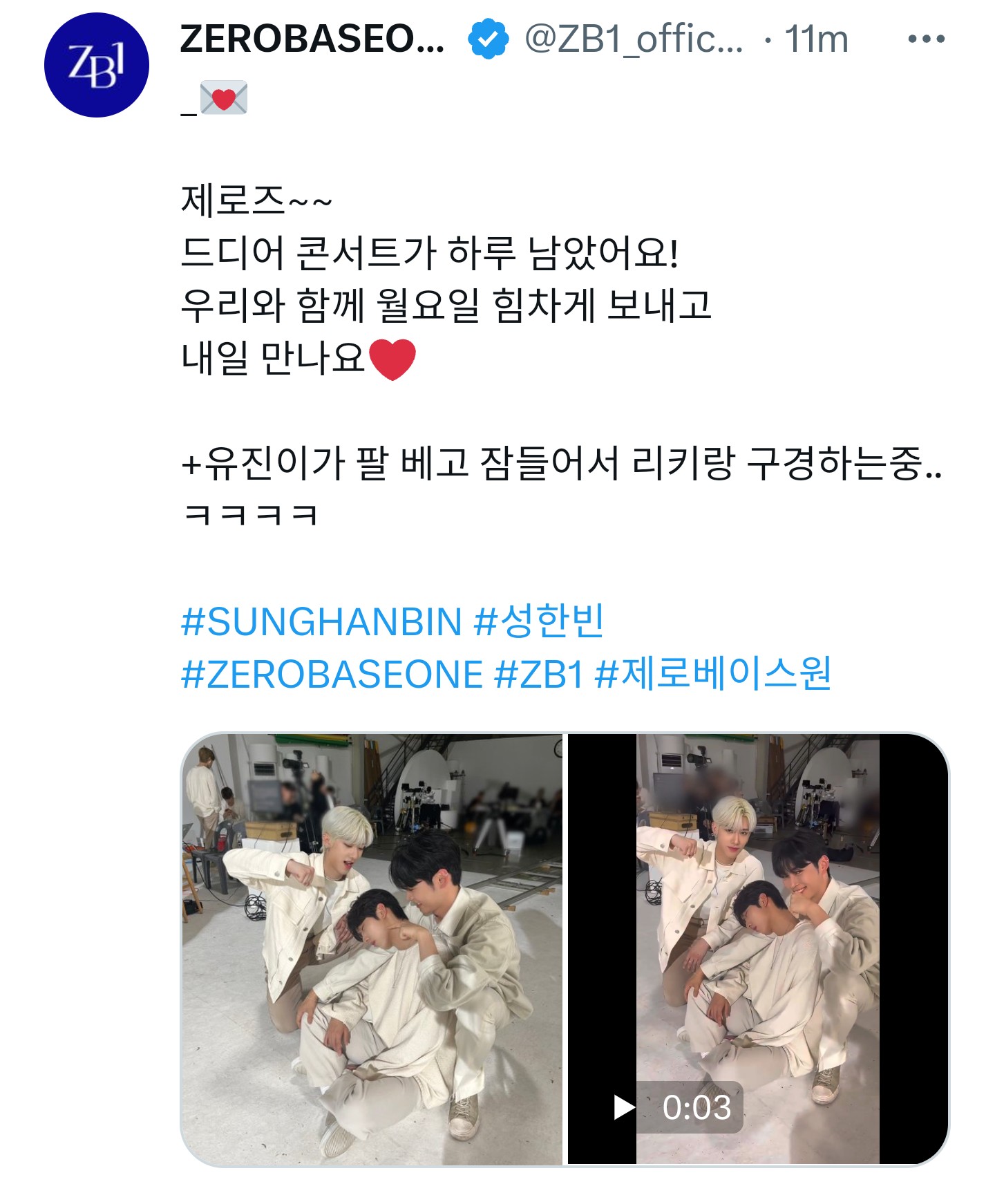 Twitter 上的 ZEROBASEONE:__💌 제로즈~~ 드디어 콘서트가 하루 남았어요! 우리와 함께 월요일 힘.mp4